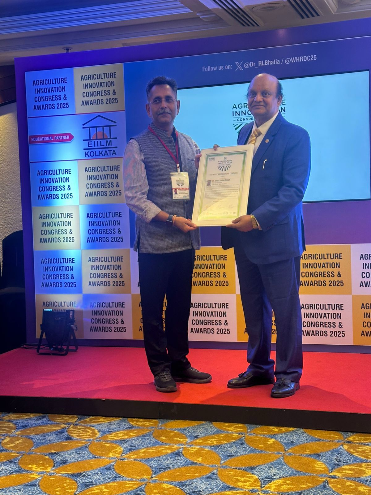 During the award ceremony, dignitaries from the Agriculture Innovation Congress handed over the framed certificate to Dr. Singh on stage, acknowledging his long-standing contribution to agricultural development. The backdrop featured the event’s branding and sustainability theme, highlighting the significance of leadership in achieving global agricultural goals.